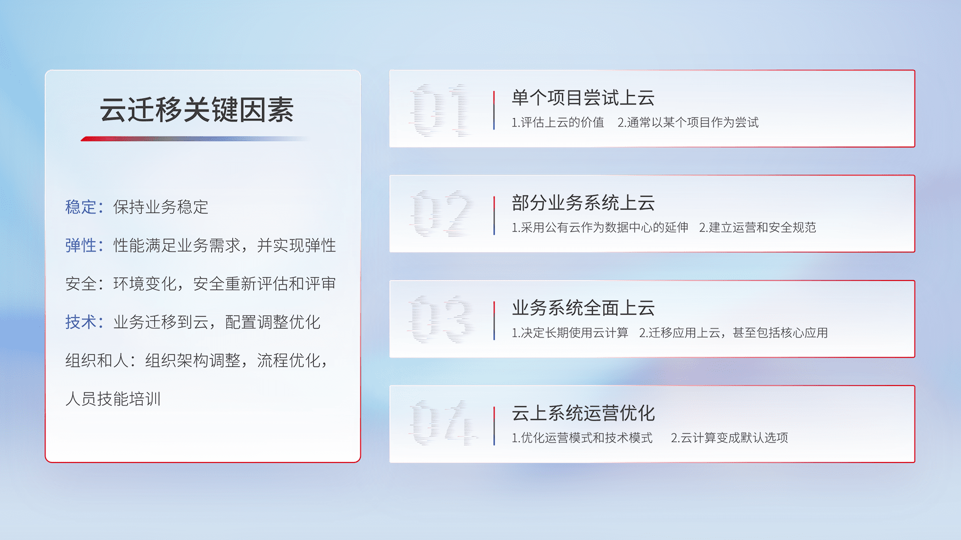 结合实际业务,,,,从规划设计、、云平台选型、、、云原生改造、、数据迁移、、、集成交付,,,迁移全过程为客户识别最佳上云路径,,,做好风险识别管理,,设计网络架构、、身份权限、、、安全审计合规、、、操作审计、、、日志审计、、、监控告警策略、、、多站点容灾设计等,,,对云上基础设施进行整体规划,,提升IT治理水平,,以满足弹性、、、高可用、、高性能的需求。。。