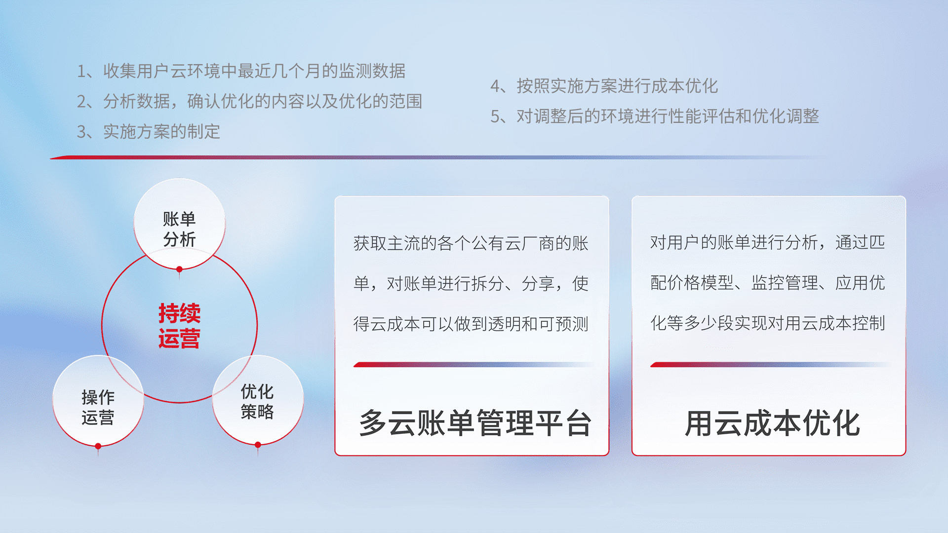 通过多云纳管,,,,以统一的资源数据模型把客户的云资源进行抽象和封装,,进而实现对多云资源的统一操作,,保障云资源管理的可靠性、、、、稳定性与可用性。。量身定制化运维内容,,,,配置、、、、开发运维、、、补丁管理、、备份、、、、监控、、认证和访问管理、、审计和日常巡检等,,,,保障在用云过程中的可靠度,,稳定度以及高可用率。。